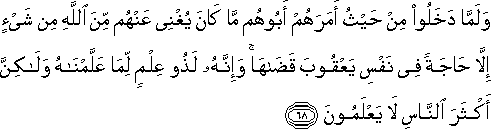 | 12.68 | And when they entered in the manner which their father had enjoined, it would have naught availed them as against Allah; it was but a need of Jacobīs soul which he thus satisfied; and lo! he was a lord of knowledge because We had taught him; but most of mankind know not. | Wa Lammā Dakhalū Min Ĥaythu 'Amarahum 'Abūhum Mmā Kāna Yughnī `Anhum Mmina Allāhi Min Shay'in 'Illā Ĥājatan Fī Nafsi Ya`qūba Qađāhā Wa 'Innahu Ladhū `Ilmin Limā `Allamnāhu Wa Lakinna 'Akthara An-Nāsi Lā Ya`lamūna |