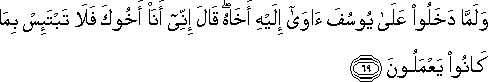 | 12.69 | And when they went in before Joseph, he took his brother unto him, saying: Lo! I, even I, am thy brother, therefore sorrow not for what they did. | Wa Lammā Dakhalū `Alá Yūsufa 'Āwá 'Ilayhi 'Akhāhu Qāla 'Innī 'Anā 'Akhūka Falā Tabta'is Bimā Kānū Ya`malūna |