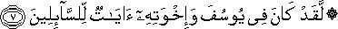 | 12.7 | Verily in Joseph and his brethren are signs (of Allahīs Sovereignty) for the inquiring. | Laqad Kāna Fī Yūsufa Wa 'Ikhwatihi 'Āyātun Lilssā'ilīna |