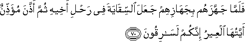 | 12.70 | And when he provided them with their provision, he put the drinking-cup in his brotherīs saddlebag, and then a crier cried: O camel-riders! Lo! ye are surely thieves! | Falammā Jahhazahum Bijahāzihim Ja`ala As-Siqāyata Fī Raĥli 'Akhīhi Thumma 'Adhana Mu'uadhinun 'Ayyatuhā Al-`Īru 'Innakum Lasāriqūna |