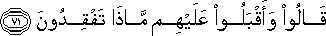 | 12.71 | They cried, coming toward them: What is it ye have lost? | Qālū Wa 'Aqbalū `Alayhim Mādhā Tafqidūna |