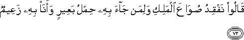 | 12.72 | They said: We have lost the kingīs cup, and he who bringeth it shall have a camel-load, and I (said Joseph) am answerable for it. | Qālū Nafqidu Şuwā`a Al-Maliki Wa Liman Jā'a Bihi Ĥimlu Ba`īrin Wa 'Anā Bihi Za`īmun |