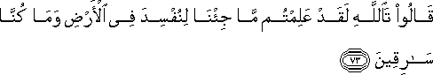 | 12.73 | They said: By Allah, well ye know we came not to do evil in the land, and are no thieves. | Qālū Ta-Allāhi Laqad `Alimtum Mā Ji'nā Linufsida Fī Al-'Arđi Wa Mā Kunnā Sāriqīna |