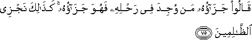 | 12.75 | They said: The penalty for it! He in whose bag (the cup) is found, he is the penalty for it. Thus we requite wrong-doers. | Qālū Jazā'uuhu Man Wujida Fī Raĥlihi Fahuwa Jazā'uuhu Kadhālika Najzī A-ālimīna |