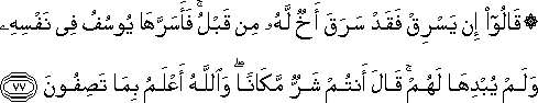 | 12.77 | They said: If he stealeth, a brother of his stole before. But Joseph kept it secret in his soul and revealed it not unto them. He said (within himself): Ye are in worse case, and Allah knoweth best (the truth of) that which ye allege. | Qālū 'In Yasriq Faqad Saraqa 'Akhun Lahu Min Qablu Fa'asarrahā Yūsufu Fī Nafsihi Wa Lam Yubdihā Lahum Qāla 'Antum Sharrun Makānāan Wa Allāhu 'A`lamu Bimā Taşifūna |