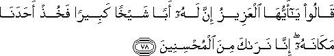 | 12.78 | They said: O ruler of the land! Lo! he hath a very aged father, so take one of us instead of him. Lo! we behold thee of those who do kindness. | Qālū Yā 'Ayyuhā Al-`Azīzu 'Inna Lahu 'Abāan Shaykhāan Kabīrāan Fakhudh 'Aĥadanā Makānahu 'Innā Narāka Mina Al-Muĥsinīna |