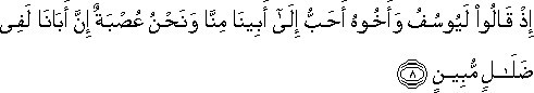 | 12.8 | When they said: Verily Joseph and his brother are dearer to our father than we are, many though we be. Lo! our father is in plain aberration. | 'Idh Qālū Layūsufu Wa 'Akhūhu 'Aĥabbu 'Ilá 'Abīnā Minnā Wa Naĥnu `Uşbatun 'Inna 'Abānā Lafī Đalālin Mubīnin |