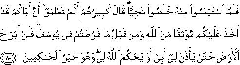 | 12.80 | So, When they despaired of (moving) him, they conferred together apart. The eldest of them said: Know ye not how your father took an undertaking from you in Allahīs name and how ye failed in the case of Joseph aforetime? Therefore I shall not go forth from the land until my father giveth leave or Allah judgeth for me. He is the Best of Judges. | Falammā Astay'asū Minhu Khalaşū Najīyāan Qāla Kabīruhum 'Alam Ta`lamū 'Anna 'Abākum Qad 'Akhadha `Alaykum Mawthiqāan Mina Allāhi Wa Min Qablu Mā Farraţtum Fī Yūsufa Falan 'Abraĥa Al-'Arđa Ĥattá Ya'dhana Lī 'Abī 'Aw Yaĥkuma Allāhu Lī Wa Huwa Khayru Al-Ĥākimīna |