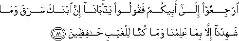 | 12.81 | Return unto your father and say: O our father! Lo! thy son hath stolen. We testify only to that which we know; we are not guardians of the Unseen. | Arji`ū 'Ilá 'Abīkum Faqūlū Yā 'Abānā 'Inna Abnaka Saraqa Wa Mā Shahidnā 'Illā Bimā `Alimnā Wa Mā Kunnā Lilghaybi Ĥāfiīna |