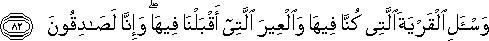 | 12.82 | Ask the township where we were, and the caravan with which we travelled hither. Lo! we speak the truth. | Wa As'ali Al-Qaryata Allatī Kunnā Fīhā Wa Al-`Īra Allatī 'Aqbalnā Fīhā Wa 'Innā Laşādiqūna |