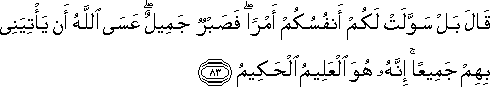 | 12.83 | (And when they came unto their father and had spoken thus to him) he said: Nay, but your minds have beguiled you into something. (My course is) comely patience! It may be that Allah will bring them all unto me. Lo! He, only He, is the Knower, the Wise. | Qāla Bal Sawwalat Lakum 'Anfusukum 'Amrāan Faşabrun Jamīlun `Asá Allāhu 'An Ya'tiyanī Bihim Jamī`āan 'Innahu Huwa Al-`Alīmu Al-Ĥakīmu |