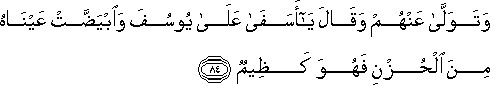 | 12.84 | And he turned away from them and said: Alas, my grief for Joseph! And his eyes were whitened with the sorrow that he was suppressing. | Wa Tawallá `Anhum Wa Qāla Yā 'Asafá `Alá Yūsufa Wa Abyađđat `Aynāhu Mina Al-Ĥuzni Fahuwa Kaīmun |