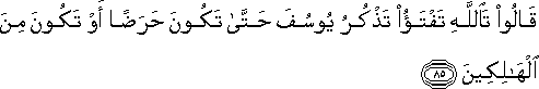 | 12.85 | They said: By Allah, thou wilt never cease remembering Joseph till thy health is ruined or thou art of those who perish! | Qālū Ta-Allāhi Tafta'u Tadhkuru Yūsufa Ĥattá Takūna Ĥarađāan 'Aw Takūna Mina Al-Hālikīna |