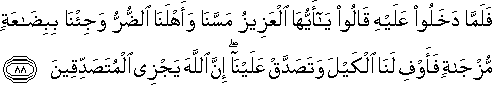 | 12.88 | And when they came (again) before him (Joseph) they said: O ruler! Misfortune hath touched us and our folk, and we bring but poor merchandise, so fill for us the measure and be charitable unto us. Lo! Allah will requite the charitable, | Falammā Dakhalū `Alayhi Qālū Yā 'Ayyuhā Al-`Azīzu Massanā Wa 'Ahlanā Ađ-Đurru Wa Ji'nā Bibiđā`atin Muzjāatin Fa'awfi Lanā Al-Kayla Wa Taşaddaq `Alaynā 'Inna Allāha Yajzī Al-Mutaşaddiqīna |