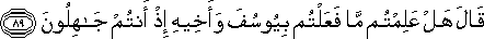 | 12.89 | He said: Know ye what ye did unto Joseph and his brother in your ignorance? | Qāla Hal `Alimtum Mā Fa`altum Biyūsufa Wa 'Akhīhi 'Idh 'Antum Jāhilūna |