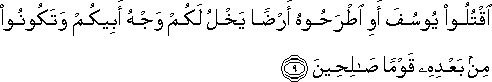 | 12.9 | (One said): Kill Joseph or cast him to some (other) land, so that your fatherīs favour may be all for you, and (that) ye may afterward be righteous folk. | Aqtulū Yūsufa 'Awi Aţraĥūhu 'Arđāan Yakhlu Lakum Wajhu 'Abīkum Wa Takūnū Min Ba`dihi Qawmāan Şāliĥīna |