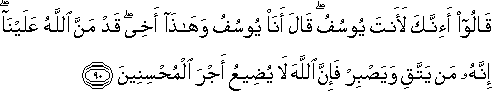 | 12.90 | They said: Is it indeed thou who art Joseph? He said: I am Joseph and this is my brother. Allah hath shown us favour. Lo! he who wardeth off (evil) and endureth (findeth favour); for lo! Allah loseth not the wages of the kindly. | Qālū 'A'innaka La'anta Yūsufu Qāla 'Anā Yūsufu Wa Hadhā 'Akhī Qad Manna Allāhu `Alaynā 'Innahu Man Yattaqi Wa Yaşbir Fa'inna Allāha Lā Yuđī`u 'Ajra Al-Muĥsinīna |