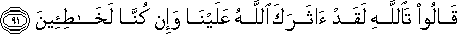 | 12.91 | They said: By Allah, verily Allah hath preferred thee above us, and we were indeed sinful. | Qālū Ta-Allāhi Laqad 'Ātharaka Allāhu `Alaynā Wa 'In Kunnā Lakhāţi'īna |