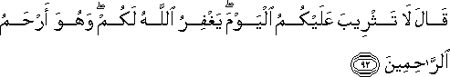 | 12.92 | He said: Have no fear this day! May Allah forgive you, and He is the Most Merciful of those who show mercy. | Qāla Lā Tathrība `Alaykumu Al-Yawma Yaghfiru Allāhu Lakum Wa Huwa 'Arĥamu Ar-Rāĥimīna |