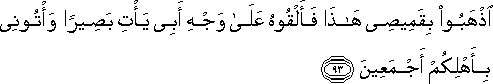 | 12.93 | Go with this shirt of mine and lay it on my fatherīs face, he will become (again) a seer; and come to me with all your folk. | Adh/habū Biqamīşī Hādhā Fa'alqūhu `Alá Wajhi 'Abī Ya'ti Başīrāan Wa 'Tūnī Bi'ahlikum 'Ajma`īna |
