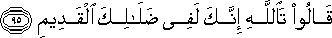 | 12.95 | (Those around him) said: By Allah, lo! thou art in thine old aberration. | Qālū Ta-Allāhi 'Innaka Lafī Đalālika Al-Qadīmi |