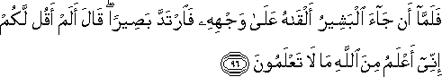| 12.96 | Then, when the bearer of glad tidings came, he laid it on his face and he became a seer once more. He said: Said I not unto you that I know from Allah that which ye know not? | Falammā 'An Jā'a Al-Bashīru 'Alqāhu `Alá Wajhihi Fārtadda Başīrāan Qāla 'Alam 'Aqul Lakum 'Innī 'A`lamu Mina Allāhi Mā Lā Ta`lamūna |