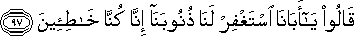 | 12.97 | They said: O our father! Ask forgiveness of our sins for us, for lo! we were sinful. | Qālū Yā 'Abānā Astaghfir Lanā Dhunūbanā 'Innā Kunnā Khāţi'īna |