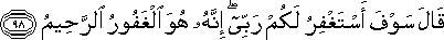 | 12.98 | He said: I shall ask forgiveness for you of my Lord. Lo! He is the Forgiving, the Merciful. | Qāla Sawfa 'Astaghfiru Lakum Rabbī 'Innahu Huwa Al-Ghafūru Ar-Raĥīmu |