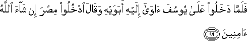 | 12.99 | And when they came in before Joseph, he took his parents unto him, and said: Come into Egypt safe, if Allah will! | Falammā Dakhalū `Alá Yūsufa 'Āwá 'Ilayhi 'Abawayhi Wa Qāla Adkhulū Mişra 'In Shā'a Allāhu 'Āminīna |